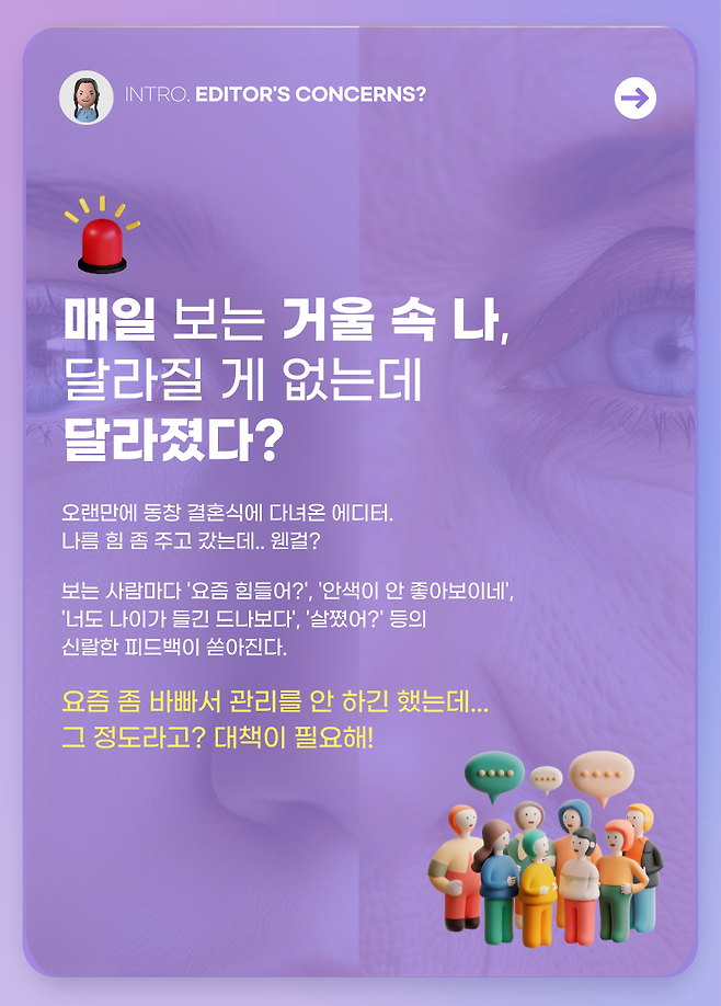 친구들과 인사를 하는데 예상과는 달리 친구들은 "안색이 좋지 않다, 살이 많이 쪘다, 부은 거 같다" 등 걱정의 말들을 건넸다. 그 말을 듣고 뷰티 에디터로서