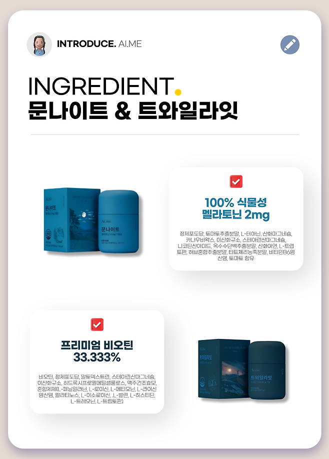 AI 자가진단 서비스에서 에디터에게 필요하다고 추천해 준 제품이 3가지가 있었는데, 그중에서 특히나 에디터의 눈길을 끈 제품은 신체 바이오리듬을 정상적으로 돌려줄 수 있는 문나이트와 트와일라잇이었다.