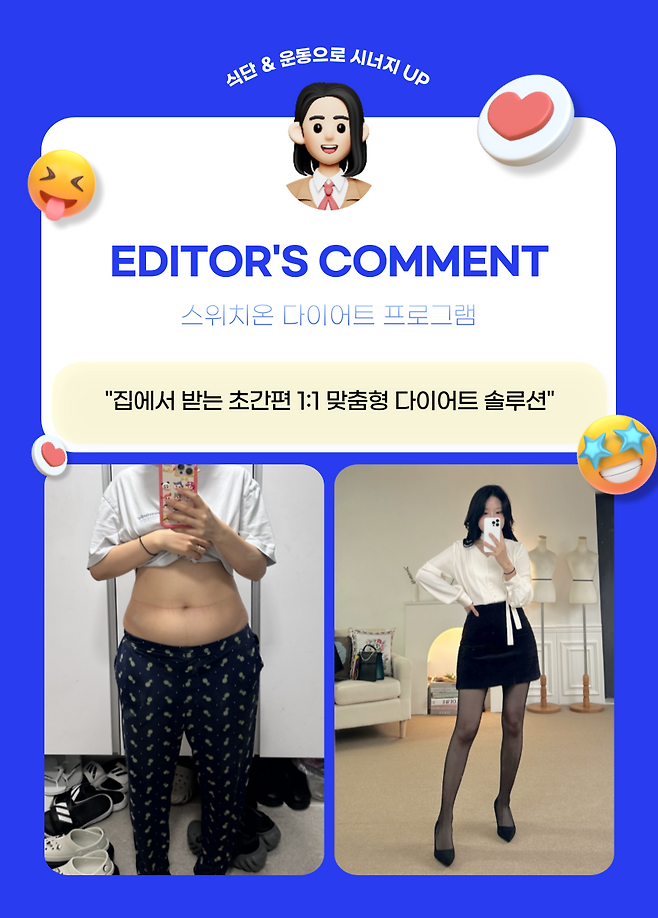 봄이 오니 에디터는 결혼식이고 돌잔치고 참석할 일들이 너무 많아져서, 급하게 스위치온 다이어트 프로그램으로 집중적이고 체계적인 다이어트를 했다.