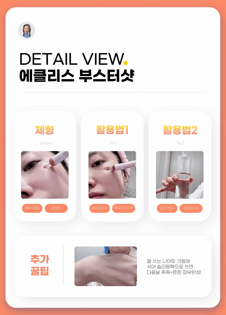 나이가 들고 환절기가 되면서 기존에 잘 쓰던 스킨케어 제품들도 피부에 잘 안 먹는 것 같아 고민이었는데 에클리스 부스터샷을 활용해 고민을 해결했다. PDRN 부스터샷은 제형이 토닉 세럼처럼 묽지만 아주 약간의 점도가 느껴지는데 얼굴에 롤링 시 쫀쫀한 느낌이 더해진다.