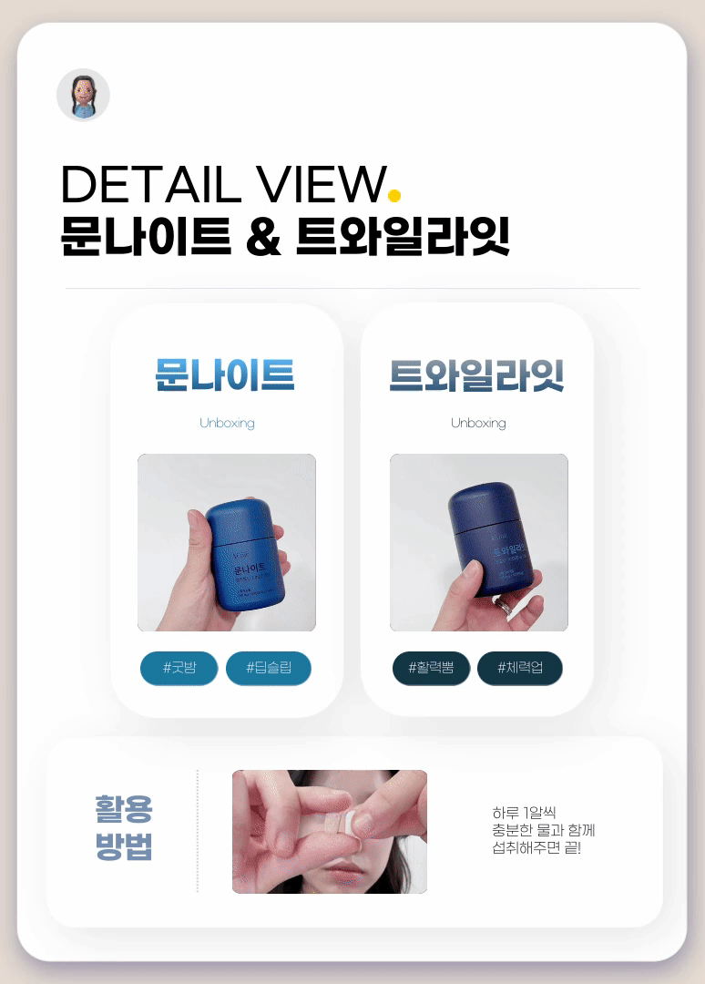 최근 입면이 잘 안되어서 힘들었는데, 문나이트 멜라토닌 식물성 영양제로 입면이 빨라지고 수면의 질이 좋아졌다. 잠을 잘 자기도 했지만, 트와일라잇 비오틴 영양제로 에너지와 영양을 보충해 줬다.