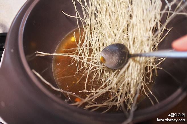 → 콩나물 삶은 물에 맛간장을 넣고 당면을 넣어 눌러가며 익힌다.