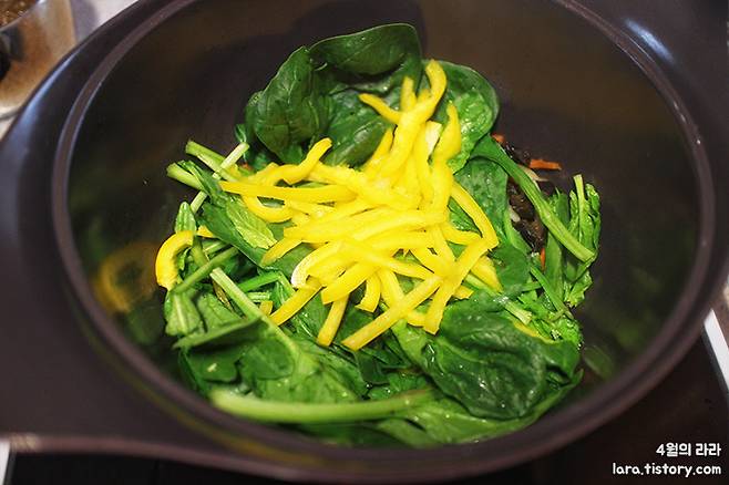 → 팬에 기름 약간 두르고 양파, 당근, 목이버섯을 볶다가 시금치, 파프리카 넣기.