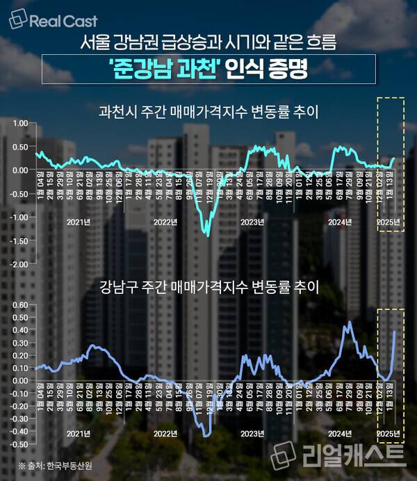 한국부동산원의 2021년 1월 1주부터 2025년 2월 4주까지 과천과 서울 강남구의 주간 매매가격지수 변동률 추이를 살펴보면 확인이 가능한데요. 특히 올해 2월 3,4주 차로 접어들면서는 직전에 비해 과천과 강남구 모두 지수가 크게 상승한 것을 알 수 있습니다.