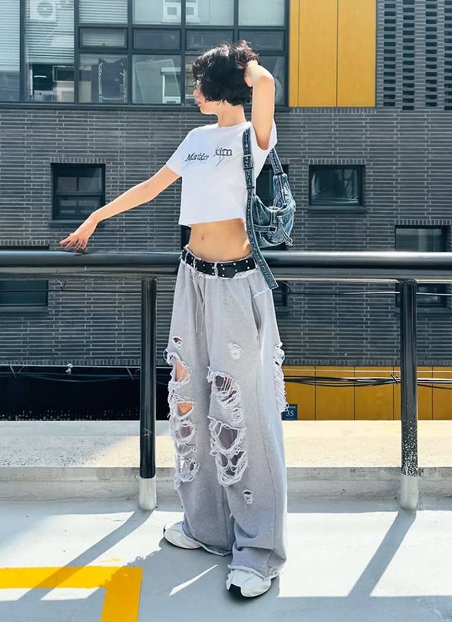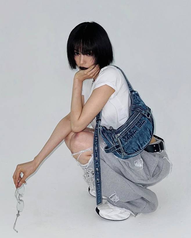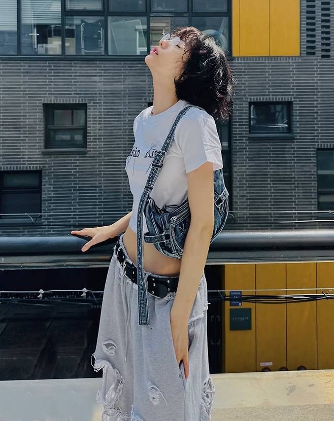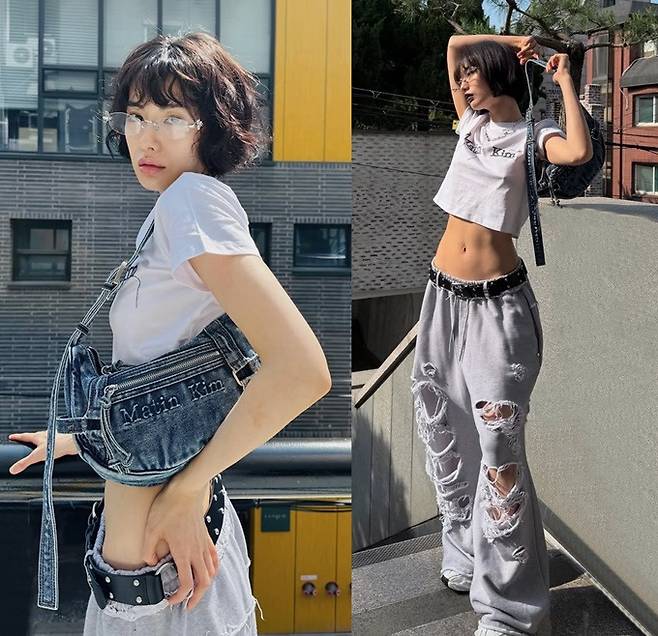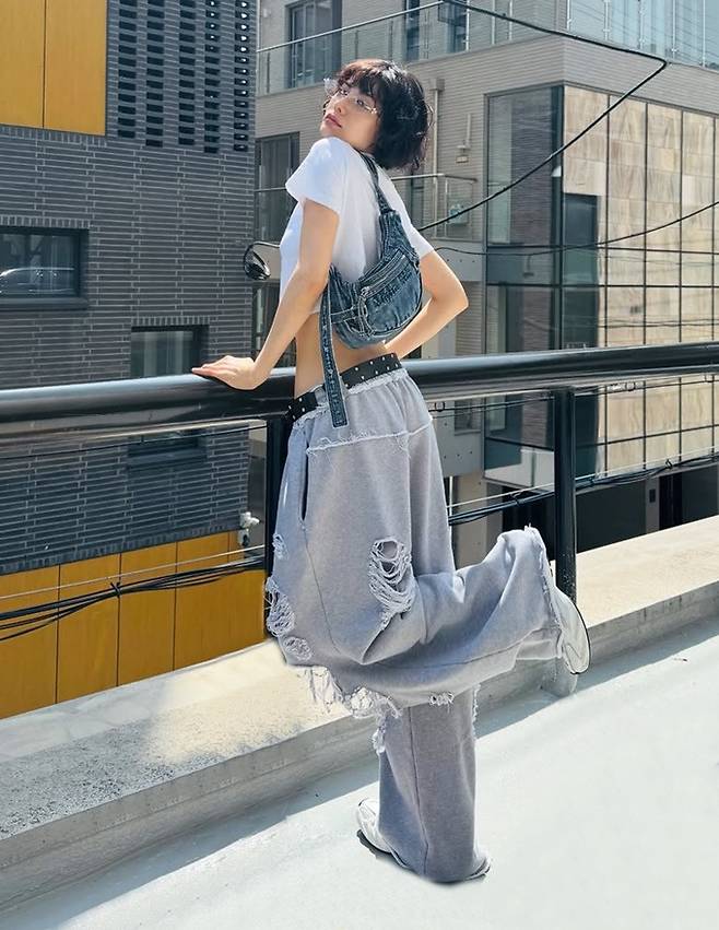 공개된 사진 속 나나는 매끈한 복근을 드러낸 화이트 로고 크롭티와 너덜너덜 할 정도의 과하게 찢어진 스웻 팬츠, 여기에 빈티지한 데님 호백을 매치한 힙한 일상룩으로 포즈를 취한 모습이 담겼다.