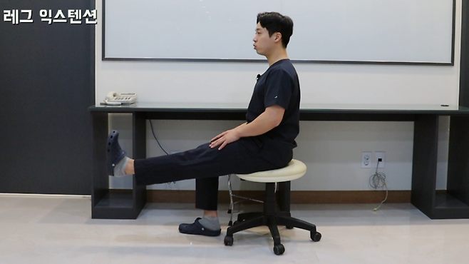 레그익스텐션은 의자에 앉은 다음 한쪽 다리를 펴준 상태에서 그대로 올리는 동작입니다. 올린 상태에서 3초를 버텼다가 그대로 내려놓고 다시 돌아옵니다. 십자인대가 파열되거나 반월상연골에 손상이 있으신 분들은 무릎을 가볍게 먼저 펴주는 동작부터 해줍니다. 무릎이 아프신 분들도 마찬가지입니다. 이 동작을 할 때 허리가 구부러지지 않도록 주의해 주세요.