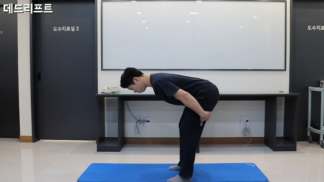 데드리프트는 무릎만 살짝 굽힌 상태에서 엉덩이를 뒤로 쭉 빼는 동작입니다. 그럼 상체는 자연스럽게 앞으로 가요. 그러다보니 굳이 무릎을 더 내릴 필요가 없습니다. 데드리프트를 하면 위 사진에서 손으로 짚은 허벅지 뒤쪽이 쭉 당길 거예요. 여기서 더 당기고 싶은 분들은 상체만 살짝 내려갔다 오면 됩니다.