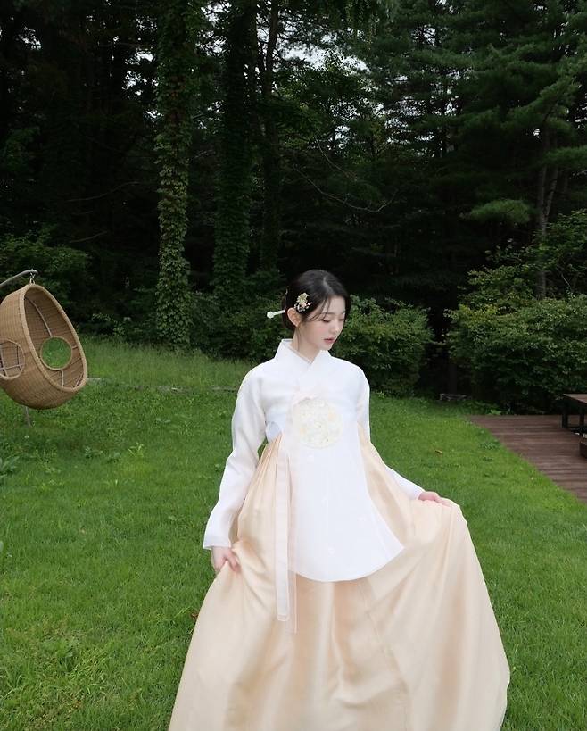 장원영은 화사한 크림 톤의 치마와 정갈한 흰 저고리로 구성된 한복을 입고 고전미를 뽐냈습니다.