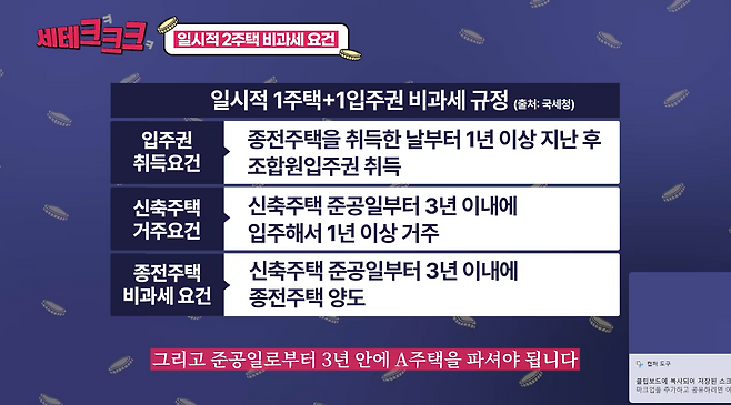 이 규정대로라면 사연자는 원래 비과세 혜택을 받지 못한다. 하지만 엄 세무사는 “입주권이나 분양권 취득으로 일시적 2주택자가 된 경우에는 종전주택 처분까지 3년 지나도 세금을 면제받을 수 있는 방법이 있다”고 했다. 그러면서 “11월 B아파트 준공 후 들어가 1년 이상 살아 실거주 목적임을 인정받고, 3년 안에 종전 주택을 매도해야 한다”고 했다.