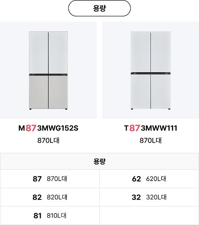 모델명의 2~3번째의 2자리 숫자 뒤에 0을 붙혀 3자리 수로 만들면 대략적인 용량대가 됩니다. 예를 들어 3~4번째 숫자인 87이라면 0만 붙히면 870L대 용량임을 확인 할 수 있다는 겁니다.
