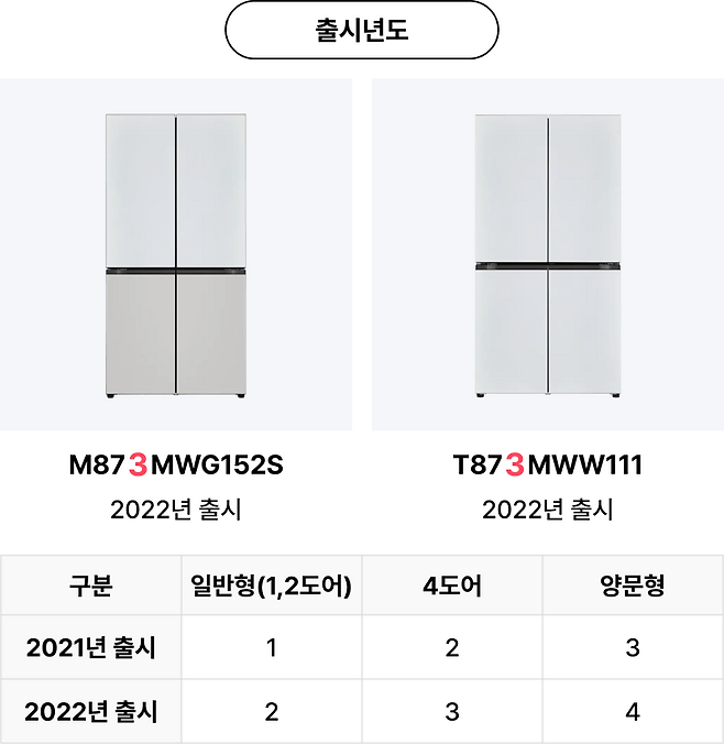 양문형은 '3'는 21년 출시, '4'는 22년 출시로 구분됩니다.