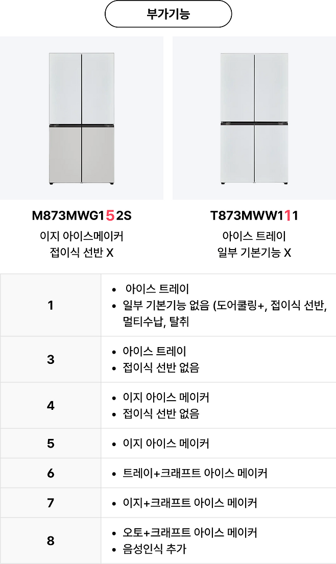 기본 기능이 탑재되지 않은 T, H 타입 제품의 모델명에 있는 '1'부터 시작하며 그 이후 차이로는 선반 유무, 아이스메이커 등급, 음성인식 기능의 차이가 있습니다.