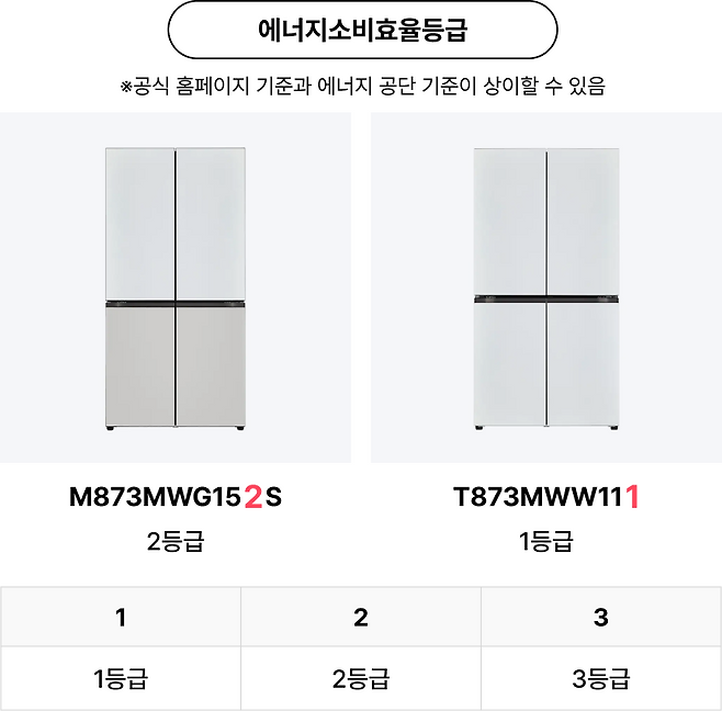 에너지 등급에 따라서 약 40~50만원 수준의 가격차가 나기 때문에 모델명만 확인하더라도 금액 혹은 등급의 우선 순위를 고려하여 선택할 수 있습니다.