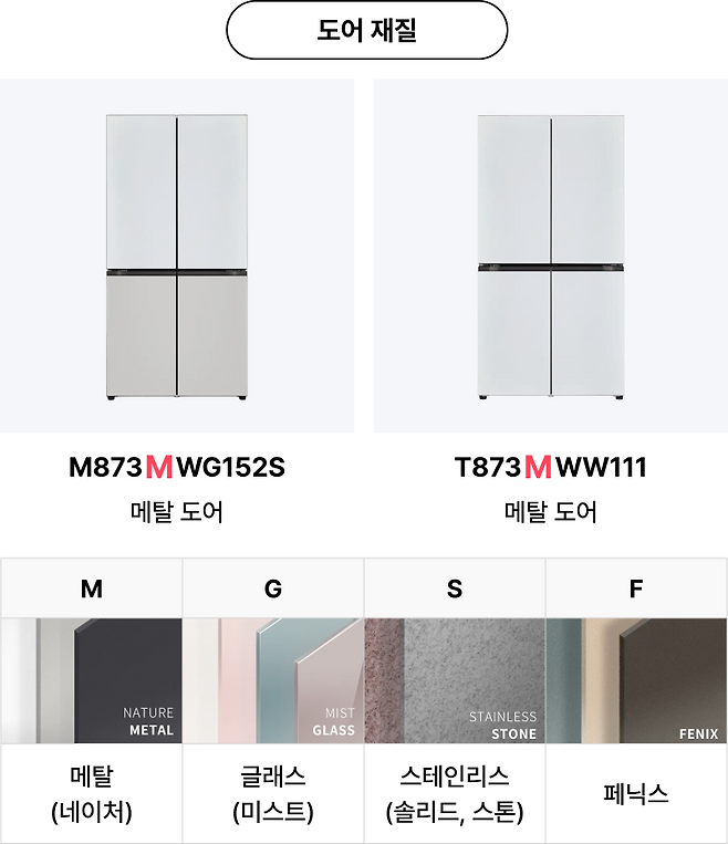 모델명 네번째 알파벳은 외부 도어의 재질을 의미하는데요. LG 오브제 컬렉션은 메탈, 글래스, 스테인리스, 페닉스 총 4개의 재질로 분류할 수 있으며, 재질의 이니셜 맨 앞자리를 딴 알파벳입니다.