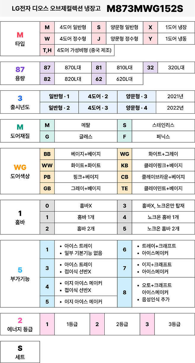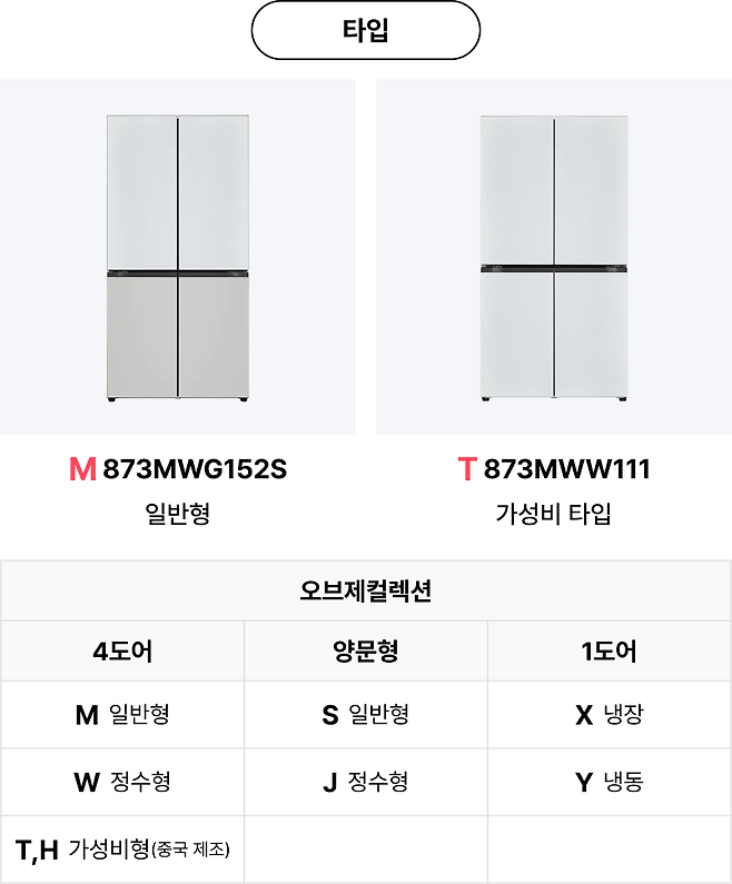 가장 앞에 있는 알파벳 첫글자는 냉장고의 타입을 나타내며 오브제 컬렉션의 4도어는 'M', 4도어 정수형은 'W', 양문형은 'S', 양문형 정수형은 'J'로 표기됩니다. 그 외 'X','Y'가 나타내는 냉장 및 냉동 1도어 컨버터블도 있습니다.