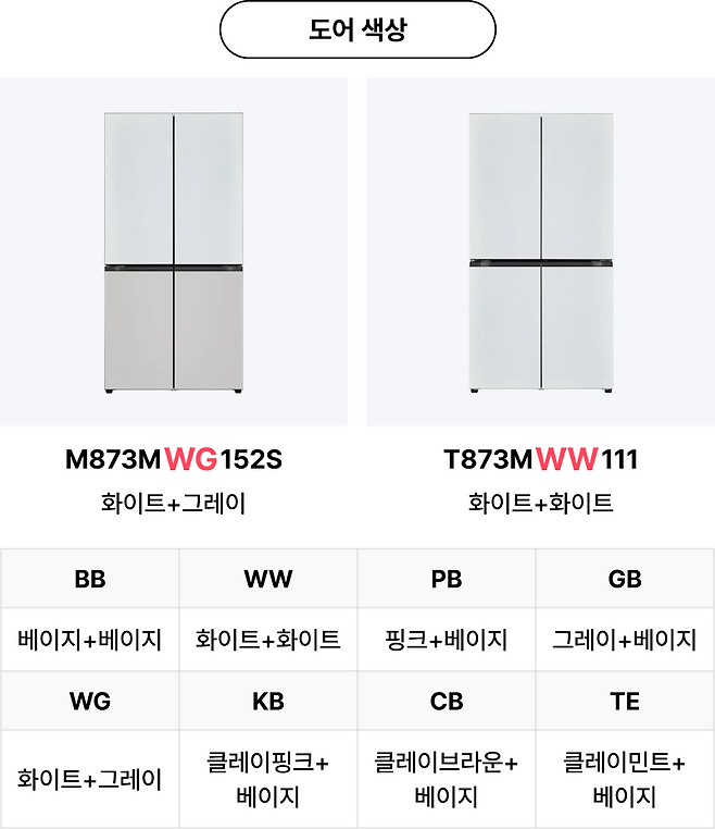 지금부터는 LG 4도어 냉장고 노써치픽(23년 2월 기준)으로 선정되어 있으며, 최근 가장 높은 구매율을 보이는 'M873MWG152S', 'T873MWW111' 오브제 컬렉션 두 모델을 예로 들어 모델명을 분석해보겠습니다.