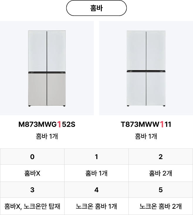 LG 냉장고는 이러한 노크온이라는 차별화된 기능의 유무를 확인 할 수 있도록 모델명 자체에 홈바에 해당하는 숫자를 넣은 것이라고 생각됩니다.