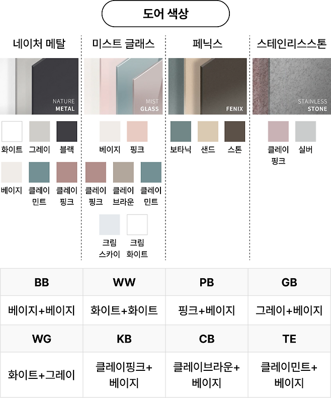 도어 색상을 의미하는 6~7번째 알파벳은 순서대로 상부와 하부의 색상 2가지 조합으로 구성되며, 대부분 색상의 맨 앞 이니셜을 따서 표기하는 것으로 보입니다.