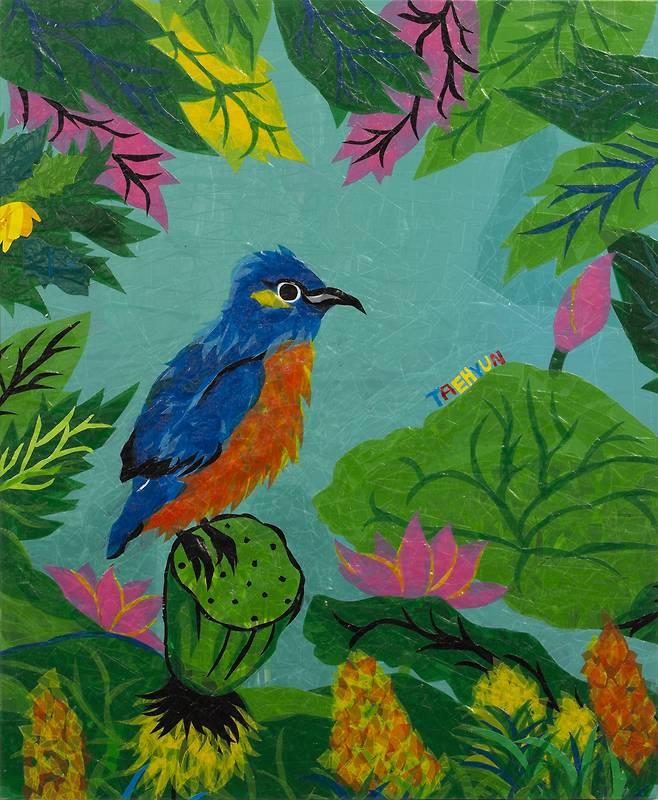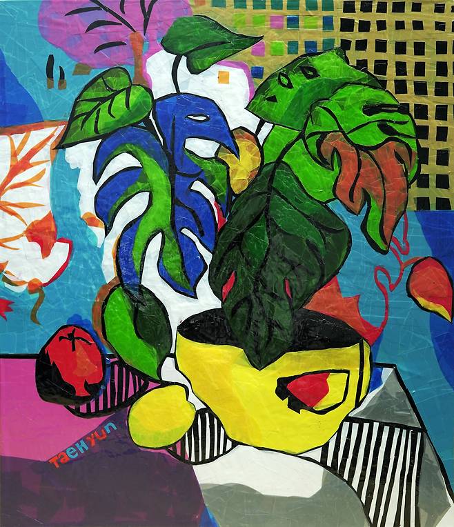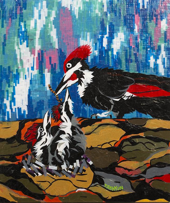 박태현 작가는 테이프로 그림을 그린다. 색깔이 단조로운 포장용 테이프가 그에게는 물감인 셈이다. 그럼에도 색감이 깊다. 테이프를 여러 차례 겹치고 겹쳐 붙여서 원하는 색을 내기 때문이다. 그의 작업을 가까이서 지켜보면 훈련이나 경험에서 비롯된 기교 이상의 경지라는 것을 알 수 있다. 특이한 것은 그림을 그릴 때 밑그림이 없이 곧장 그림을 그린다는 것이다. 이는 박태현 작가가 지닌 매우 특별한 능력이다. 테이프를 붙여서 면을 채워가다 보면 어느새 형태가 어렴풋이 보이기 시작하는데 그 과정이 환상적이다.