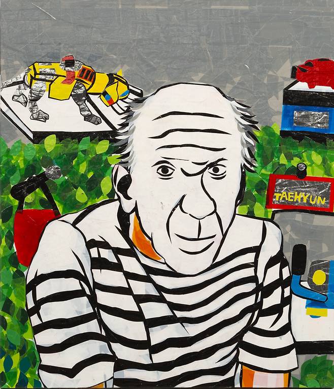박태현 작가는 색깔이 단조로운 포장용 테이프로 그림을 그린다. 그에게는 물감인 셈이다. 그럼에도 색감이 깊다. 테이프를 여러 차례 겹치고 겹쳐 붙여서 원하는 색을 내기 때문이다. 그의 작업의 특이한 것은 그림을 그릴 때 밑그림이 없이 곧장 그림을 그린다는 것이다. 그림을 그릴 때 형태를 안에서 채워가다가 바깥에서 마무리하는 것, 먼저 면을 채워서 선을 이끌어 내는 것, 상대와 일상의 대화가 제한적인 작가가 대상의 특징을 콕 집어내 그림으로 그것도 테이프로 표현해 낸다는 것이다.