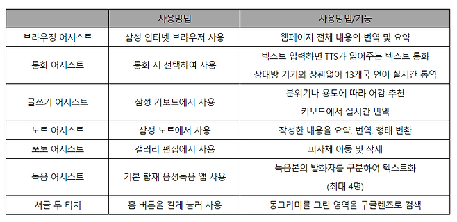 현재까지 공개된 갤럭시 AI를 활용한 기술은 아래와 같다. 이외에도 이미지 모델 어시스트인 "날씨 및 시간 배경화면"과 "생성형 배경화면"도 있으며 "날씨 및 시간 배경화면"은 현재 위치한 지역의 날씨 및 시간을 반영하여 배경화면에 날씨 효과를 추가해주는 기능이다. 해당 기능은 설정에서 "유용한 기능">"실험실"을 선택하여 활성화해야지 사용할 수 있다. "생성형 배경화면"은 사용자가 원하는 단어를 조합하여 배경화면을 만들어주는 기능이다.
