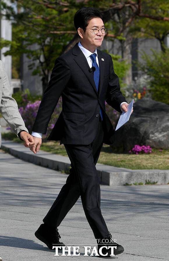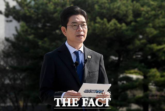 [더팩트 | 박상민 기자] 정원오 더불어민주당 서울시장 후보가 14일 오전 서울 용산구 국립중앙박물관 거울못 앞에서 문화관광 관련 공약 발표를 하고 있다.