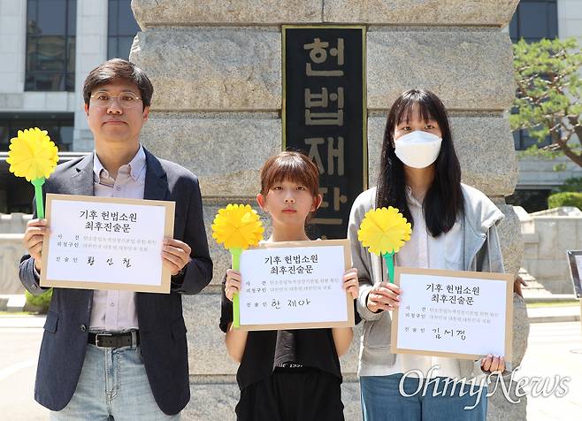 | ▲ 21일 오후 서울 종로구 헌법재판소앞에서 열린 기후 헌법소원 마지막 공개변론 공동기자회견에 참석한 최종 진술자 황인철 시민기후소송 청구인, 한제아 아기기후소송 청구인, 김서경 청소년기후소송 청구인. |