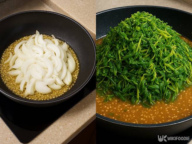 먼저 팬에 올리브유와 참기름을 두르고, 다진 마늘과 송송 썬 대파를 넣어 약불에서 천천히 볶는다. 이 과정에서 향이 올라오며 기름에 마늘과 파 맛이 배인다. 이어 큼직하게 채 썬 양파를 넣고 중불에서 투명해질 때까지 익힌다. 여기에 된장을 넣고 다시 1~2분 정도 볶아주면 기름에 구수한 된장 향이 살아난다.