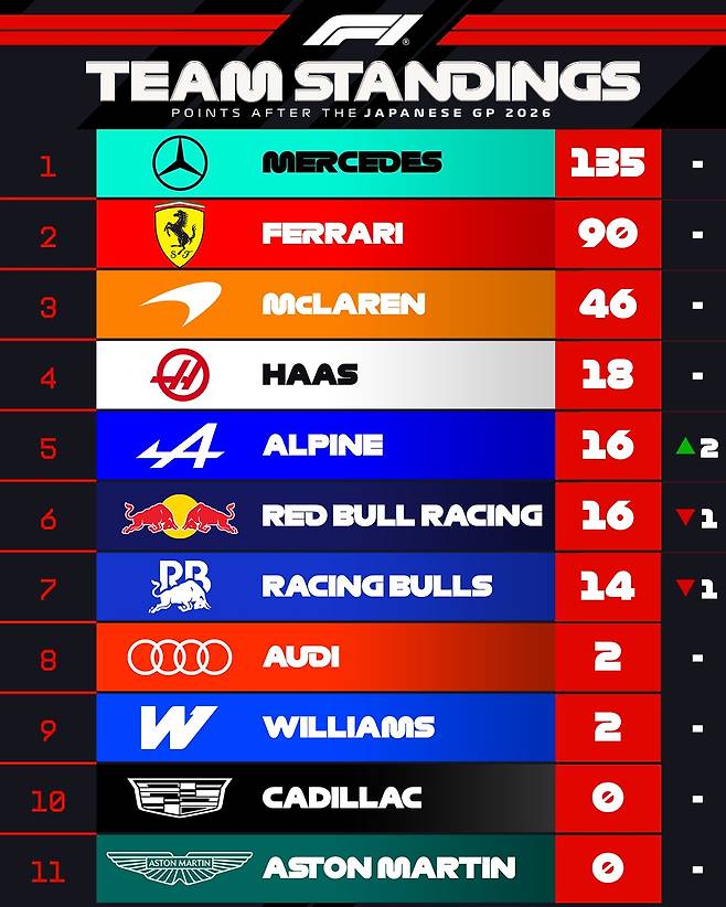 지난 시즌 강자였던 막스 페르스타펜은 일본 GP 8위에 그치며 12점으로 9위까지 밀려났다. 컨스트럭터 부문에서는 메르세데스가 135점으로 독주 중이며, 2위 페라리(90점)와의 격차는 45점에 달한다. 맥라렌(46점)이 3위로 뒤를 잇고, 하스(18점), 알핀(16점), 레드불 레이싱(16점) 등이 중위권 경쟁을 형성하고 있다.