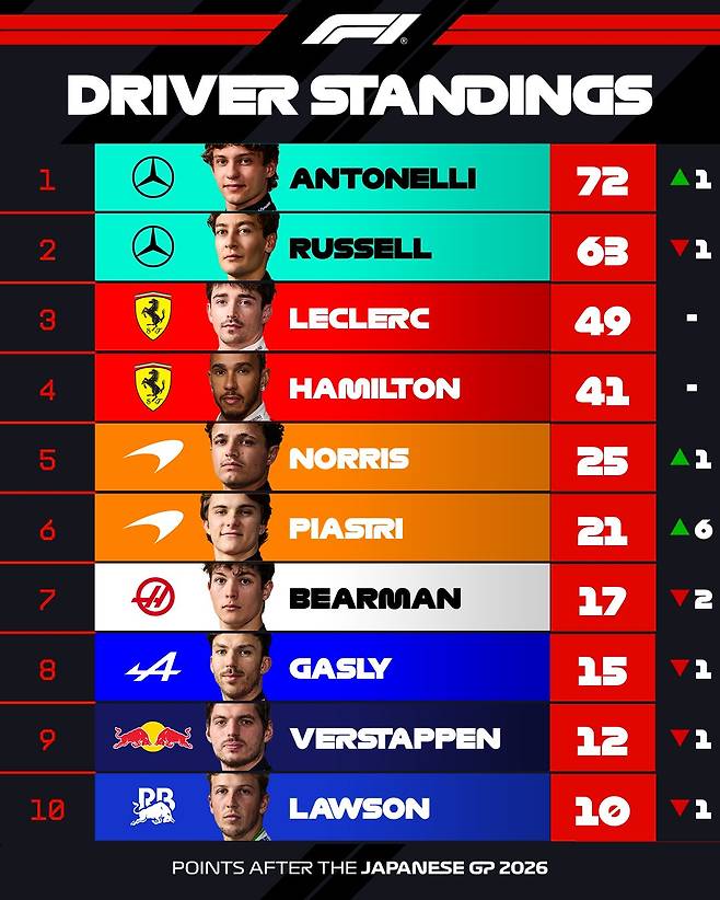 이번 우승으로 안토넬리는 시즌 누적 72점을 기록, 팀 동료 조지 러셀(63점)을 9점 차로 제치고 역대 최연소 드라이버 랭킹 1위에 올랐다. 중국 GP까지만 해도 러셀(51점)이 안토넬리(47점)를 앞서고 있었으나, 일본에서 순위가 완전히 뒤집혔다.