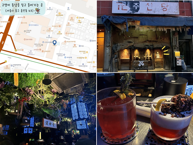 신당동의 ‘힙당동’ 골목에는 점집처럼 꾸며진 바도 있다. 고양이 동상을 밀고 들어가야 입장이 가능한 이곳은 신비롭고 웅장한 분위기로, 마치 현대와 전통이 공존하는 무속 공간을 연상케 한다. 내부에는 한국 민속 오브제들이 배치되어 있고, 높은 천장과 어두운 조명 속에서 십이지신 칵테일을 즐길 수 있다.