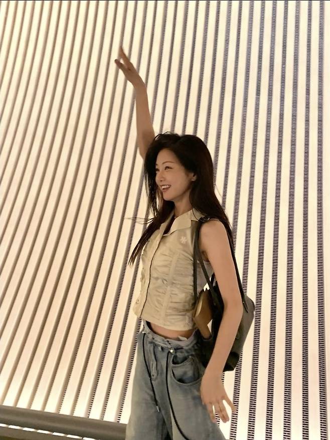 이세희는 은은한 광택이 감도는 베이지 컬러의 크롭 베스트를 입어 잘록한 허리 라인을 드러내면서도, 루즈핏 와이드 데님 팬츠로 편안한 무드를 더했습니다.
