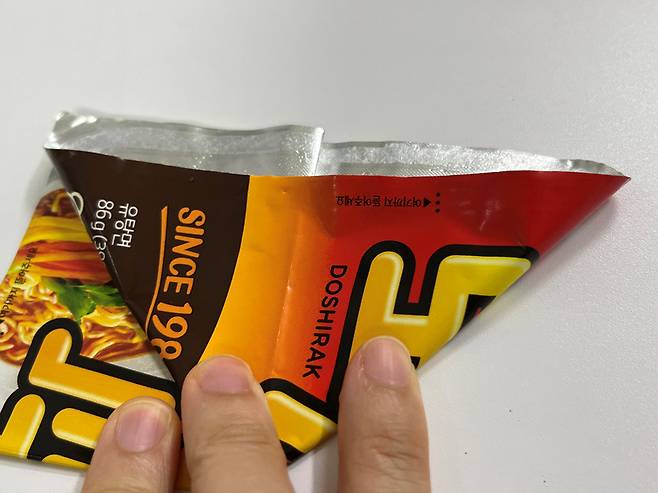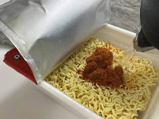 사각 컵라면 뚜껑을 활용하는 방법입니다. 표시선까지 뚜껑을 뗀 후 수프를 넣고 뜨거운 물을 부어 조리해 주세요.