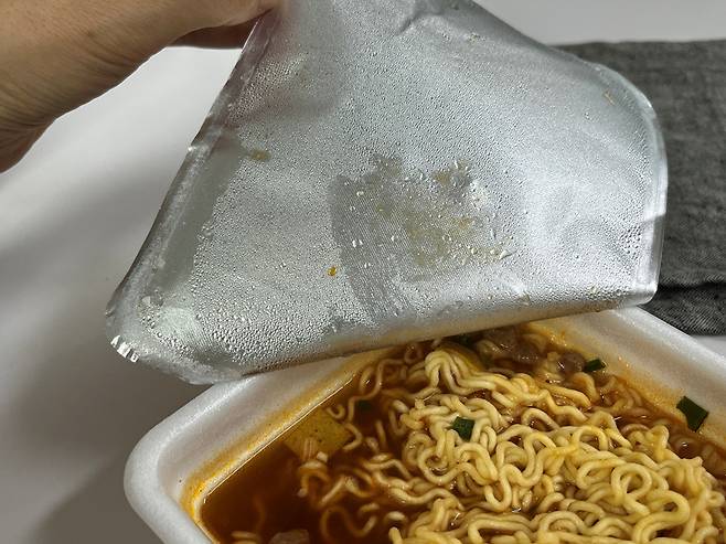 라면이 다 익으면 컵라면 뚜껑을 떼줍니다. 이때 절대 버리지 마시고 저처럼 따라 해보세요!