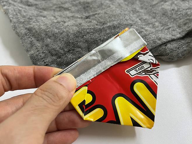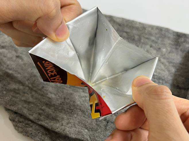 끝에 은박 부분을 바깥쪽으로 접습니다. 오각형의 맨 위 꼭짓점 방향으로 접으면 됩니다.