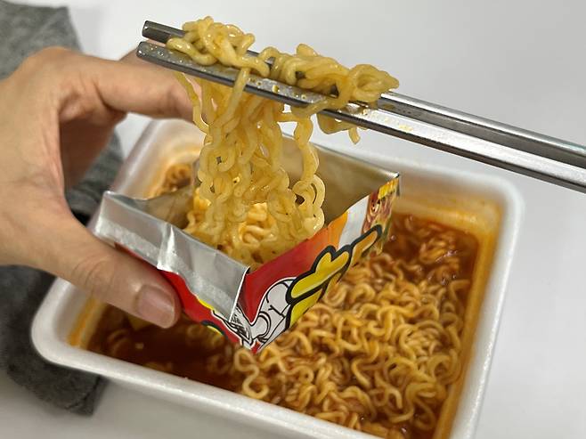 딱 라면 한 젓가락 정도가 담기는 양입니다. 라면은 덜어서 식혀 먹기에 안성맞춤입니다. 이제는 사각 컵라면 뚜껑, 절대 버리지 마시고 앞접시로 활용해 보세요!