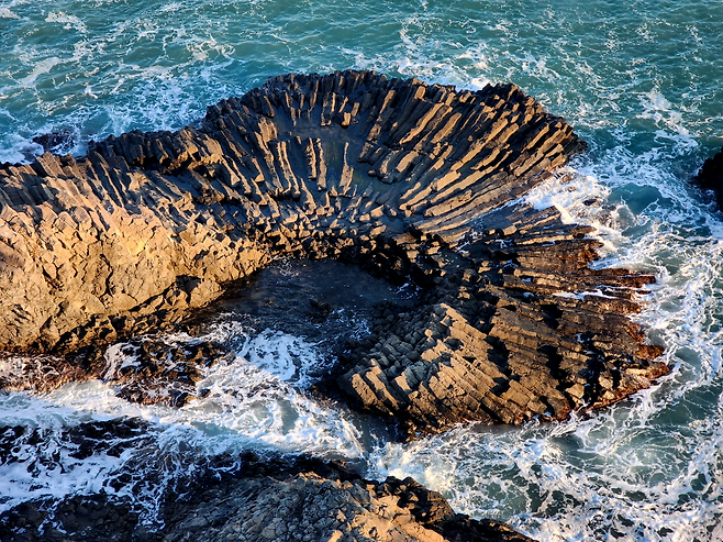 정자항을 지나 만나게 되는 강동화암 주상절리는 해파랑길 10코스의 대표 풍경 중 하나입니다. 동해안에서 가장 오래된 용암 주상절리로, 횡단면이 마치 꽃무늬처럼 퍼져 있는 것이 특징입니다.