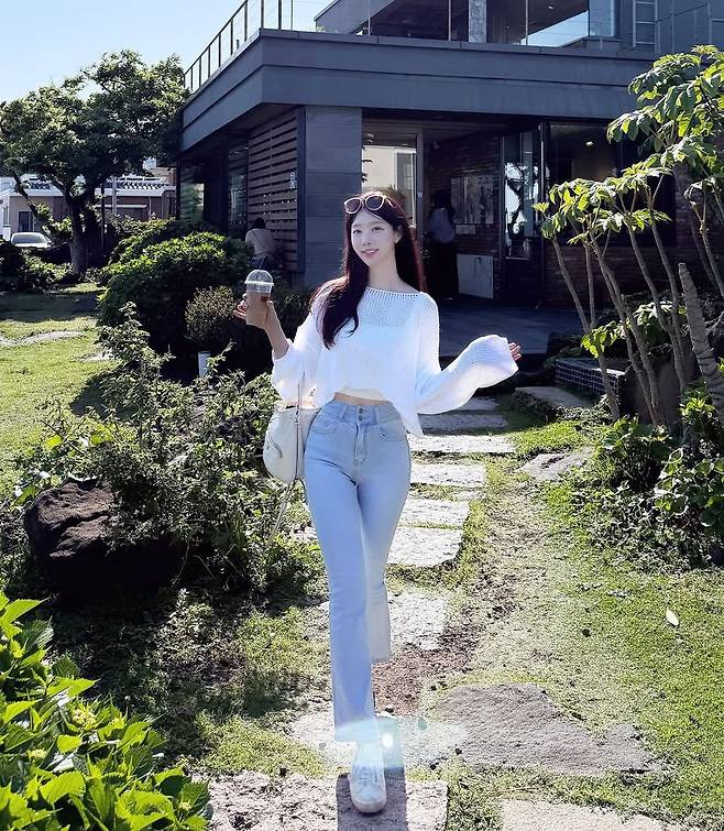 진달래, 제주 여행룩에서 빛난 화이트 니트와 데님 스타일