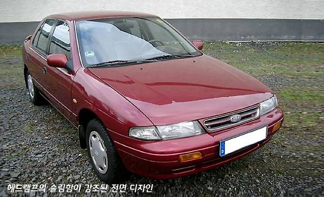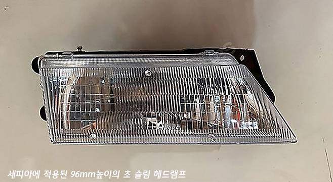 세피아의 차체 자세는 낮은 후드와 높은 데크를 가진 이른바 쐐기 스타일로 디자인됐는데, 특히 전면 헤드램프의 높이가 96mm의 초 슬림 구조였다. 이렇게 세피아의 헤드램프를 슬림 하게 만들 수 있었던 건 헤드램프 렌즈 재료를 합성수지로 만들었기 때문이었다.
