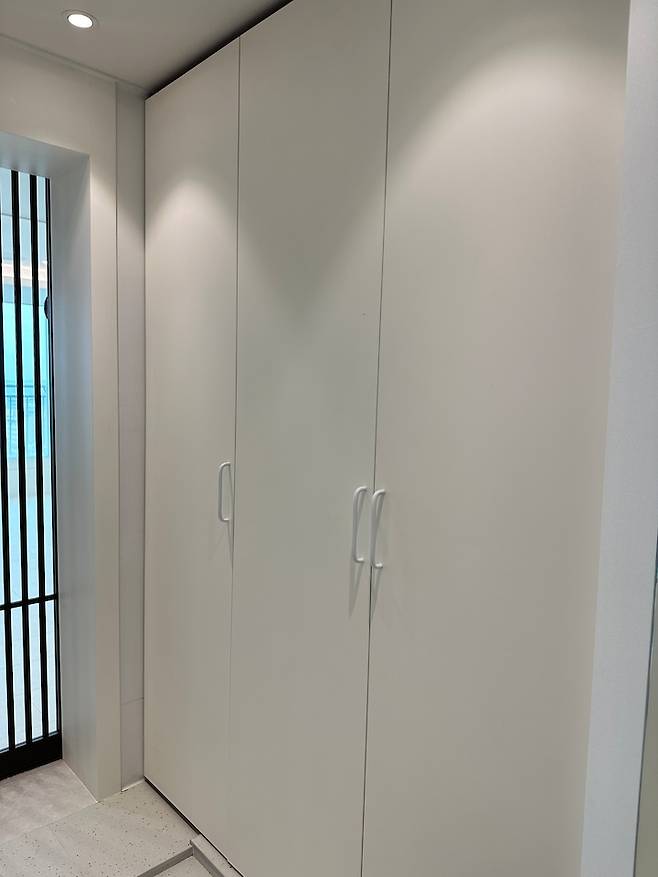 마찬가지로 반대편에도 기존에 있던 장은 철거하고 붙박이장과 동일한 문을 달아서 간이 창고를 만들었어요. 청소기와 로봇 청소기를 등을 보관하기도 하고 큰 백팩도 두고 있답니다.
