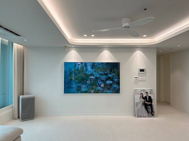 반매립 시공으로 더프레임의 장점을 살린 덕분에 TV 안 볼 때는 그저 사진이 걸린 액자같아 보여서 갤러리 느낌도 나고 좋아요. 원하는 이미지로 교체할 수 있다는 점도 큰 장점입니다.