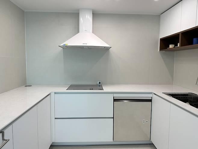 상부장을 떼낸 전면에는 화이트 색상의 하츠 주방 후드를 달고 식기세척기와 인덕션은 비스포크 인피니트 라인으로 맞추었어요. 일부러 너무 주방이 하얗게 보이지 않게 하얀색은 피해서 나름 톤을 맞췄어요. 하부장은 미닫이로 제작해서 자주 쓰는 그릇들을 모아 놓았더니 그릇을 꺼내고 집어넣을 떼 편하고 넓어 보인다는 장점이 있습니다.