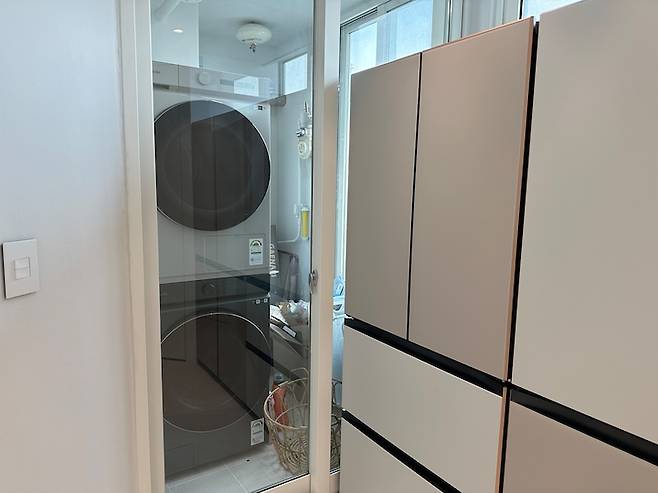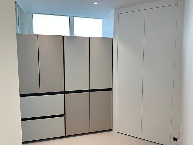 주방 사진만 본 분들은 냉장고가 어디 있는지 궁금해 하시는데요. 보조주방에 몰아 넣었답니다. 저희는 2인 가구이지만 김치냉장고도 필수라는 남편의 강력한 의견에 어쩌다 보니 냉장고가 2대가 되었어요. 삼성 비스포크 4도어 키친핏 제품이며 냉장고들의 상, 하부를 코타화이트, 새틴베이지 컬러로 맞추었습니다.