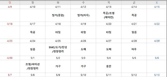철거부터 시작된 모든 공정은 위 일정표에 따라 약 4주 간 진행됐습니다. 공사 중에는 수시로 집에 가봐야 한다는 말에 저도 2~3일에 한 번 꼴로 방문해서 그 때 그 때마다 추가, 보완해야할 점들 요청 드렸어요. 필요한 사항들은 공사 중에 말씀 드려야 돈도, 시간도 아낄 수 있으니 귀찮으시더라도 공사 중에 자주 현장에 가보기 추천드려요!