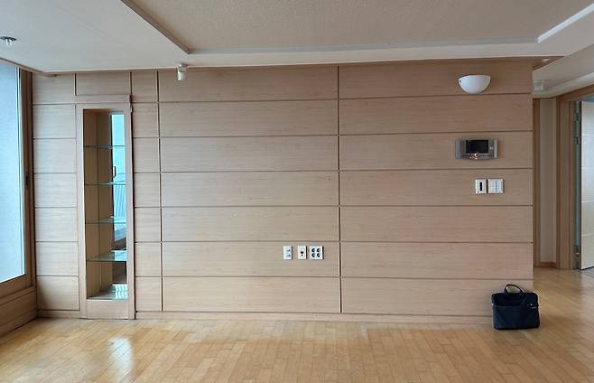 TV 벽면은 몰딩이랑 같은 색으로 아트월이었는데요. 특이하게도 벽 한 쪽에 매립 선반이 있었어요. 매립 선반은 유리 선반에 두꺼운 몰딩이 올드하면서도 TV 시청할 때 시야가 방해될 듯 해서 보자마자 철거 해야겠다고 생각했죠!