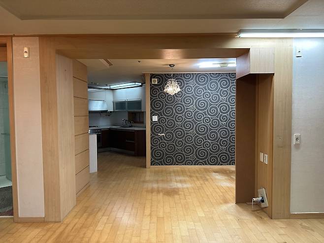 거실과 주방 사이에 위치한 다이닝룸은 오래되고 낡은 벽지와 샹들리에 조명에 곰팡이 생긴 마룻바닥, 두꺼운 몰딩이 눈에 띄었어요.