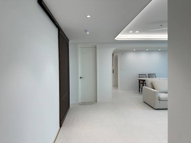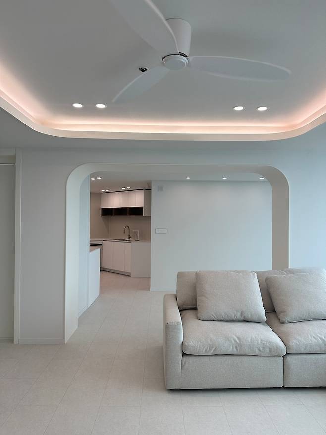 전과 비교하면 거실이 훨씬 넓게 느껴지지 않나요? 바닥은 동화마루 강마루 제품으로 콰이엇 웨이브 색상으로 골랐어요. 아치 게이트는 끝에 라인을 입체감 있게 디자인했더니 더욱 세련된 거실이 되었어요. 우물천장 간접 라인조명부터 매립등까지 조명도 여러 개 설치했습니다.