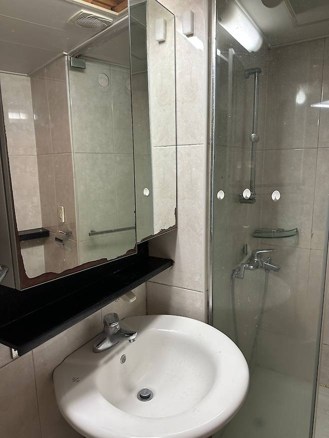 세면대는 큰 거울장이 있었는데 거울 모서리 부분이 많이 벗겨져 있었어요. 그리고 사진에서 티는 안나지만 욕실도 반듯한 네모형 구조가 아니라 사다리꼴과 비슷한 사선형 구조였어요.