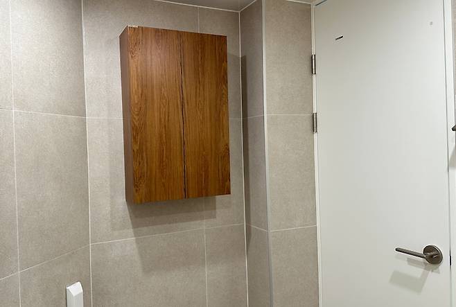 욕실 문을 열면 안으로 쑥 들어간 뒷 공간이 있었고, 신발장 같은 긴 수납장이 자리 잡고 있었어요.