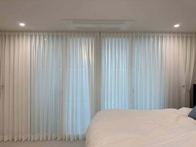 침실은 베란다가 있어서 굳이 암막 커튼 달 필요가 없겠더라구요. 그래서 가벼운 쉬폰 커튼을 달았어요.